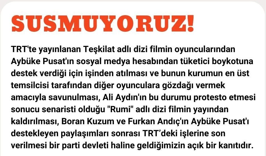 TRT’te yayınlanan Teşkilat adlı dizi filmin oyuncularından Aybüke Pusat’ın sosyal medya hesabından tüketici boykotuna destek verdiği için işinden atılması ve bunun kurumun en üst temsilcisi tarafından diğer oyunculara gözdağı vermek amacıyla savunulması, Ali Aydın’ın bu durumu protesto etmesi sonucu senaristi olduğu “Rumi” adlı dizi filmin yayından kaldırılması, Boran Kuzum ve Furkan Andıç’ın Aybüke Pusat’ı destekleyen paylaşımları sonrası TRT’deki işlerine son verilmesi bir parti devleti haline geldiğimizin açık bir kanıtıdır.