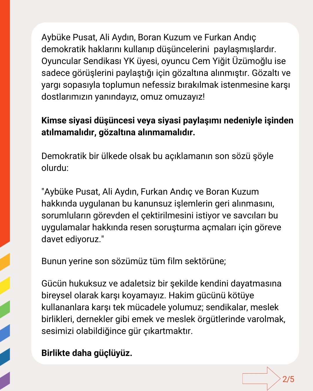 an Kuzum ve Furkan Andıç demokratik haklarını kullanıp düşüncelerini paylaşmışlardır. Oyuncular Sendikası YK üyesi, oyuncu Cem Yiğit Üzümoğlu ise sadece görüşlerini paylaştığı için gözaltına alınmıştır. Gözaltı ve yargı sopasıyla toplumun nefessiz bırakılmak istenmesine karşı dostlarımızın yanındayız, omuz omuzayız!