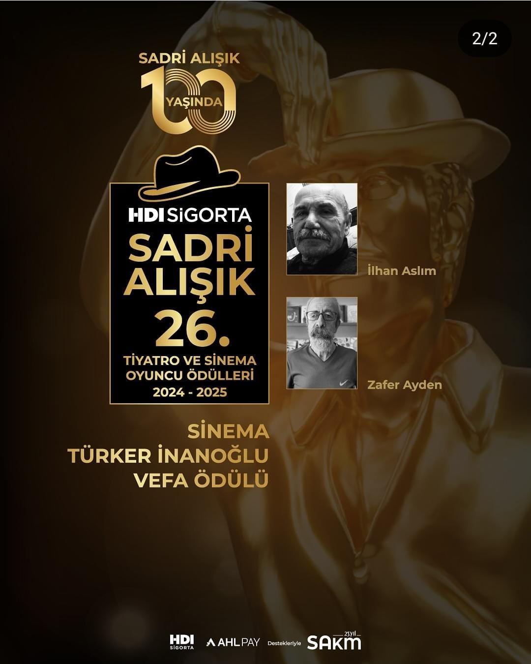 26. Sadri Alışık Tiyatro ve Sinema Ödülleri töreni 15 Eylül 2025 akşamı AKM’de yapıldı. Zafer Ayden, Türker İnanoğlu Vefa Ödülü’nü ışık şefi İlhan Aslım ile beraber aldı.
