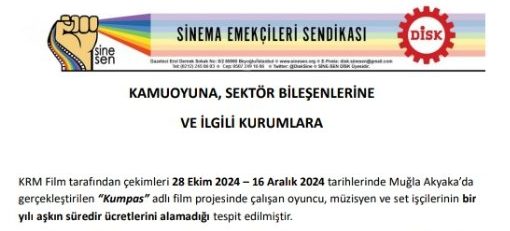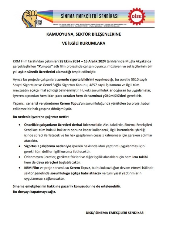 KRM Film ve Kerem Topuz’un 2024’te çektiği Kumpas filminde çalışan müzisyen, oyuncu ve set emekçileri 1 yılı aşkın süredir ücretlerini alamadı, sigortasız çalıştırıldı. Sinema emekçilerinin hakları gasp edilemez. Mücadeleye devam edeceğiz.