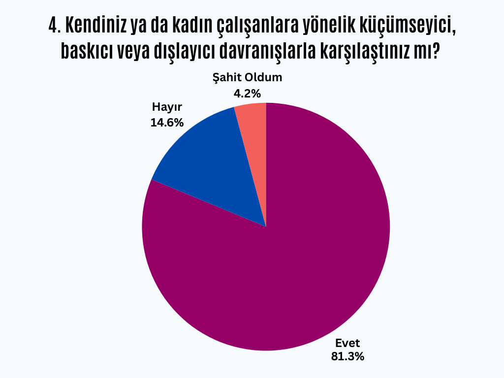 Cevaplardan elde edilen sayısal veriler bize şunu gösteriyor ki; sektörde çalışan kadınların %87,2‘si taciz, şiddet, mobbing veya sınır ihlali gibi ağır durumlarla karşılaşmaktadır. Bu oran, her 10 kadından yaklaşık 9’unun çalışma hayatında güvenli bir alana sahip olmadığını kanıtlar niteliktedir. Üstelik bu baskı ortamı, katılımcıların %81,3‘ünün küçümseyici ve dışlayıcı davranışlara maruz kalmasıyla desteklenmekte, kadınların %59,6′sı ise doğrudan cinsiyetleri nedeniyle ayrımcılığa uğradığını açıkça ifade etmektedir. Sektördeki deneyim süresi fark etmeksizin (katılımcıların %44,9’u 10 yıl ve üzeri deneyimlidir) bu sorunların devam etmesi, cinsiyetçiliğin profesyonel kıdemle değil, sektörel kültürle ilgili kökleşmiş bir sorun olduğuna işaret etmektedir.