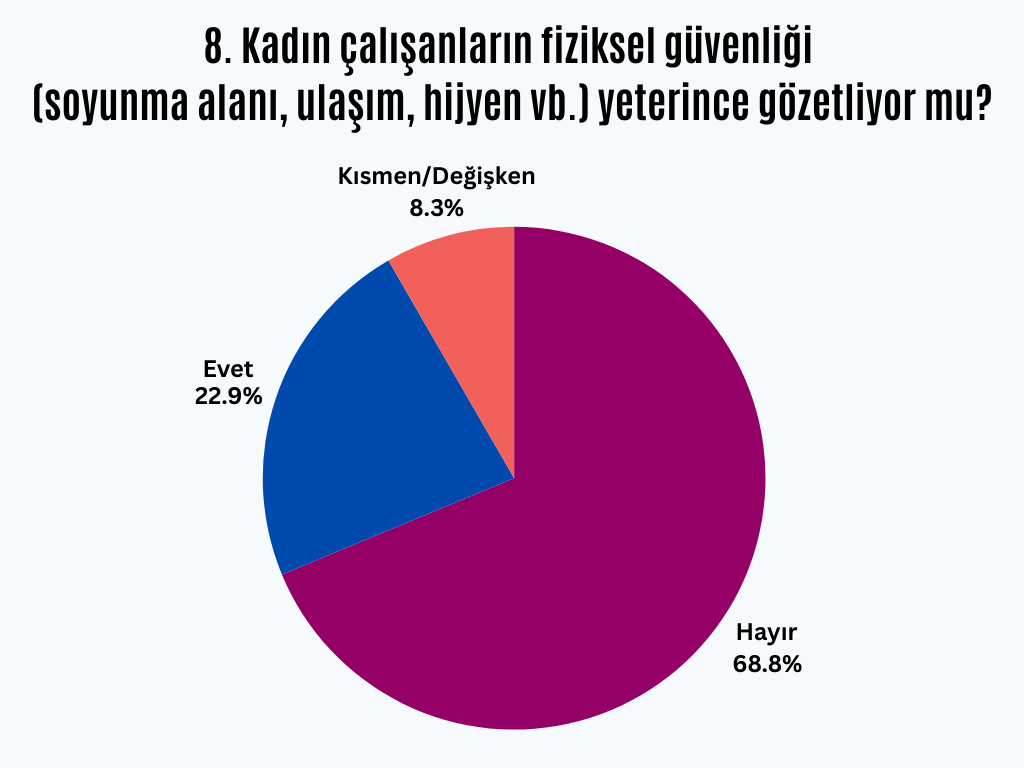 Verilerdeki en kritik açmazlardan biri, bu ihlaller karşısında başvurulacak mekanizmaların eksikliğidir; çalışanların %66‘sı kendilerini koruyacak bir dayanışma ağı veya hukuki mekanizma bulamamaktadır. Bu durum, katılımcıların %68,8‘inin fiziksel güvenlik (soyunma alanı, hijyen, ulaşım) konusunda “hayır” cevabı vermesiyle birleştiğinde, kadınların hem fiziksel hem de hukuki olarak korumasız bırakıldığını göstermektedir. Ayrıca, kadın çalışanların yaptığı işten ziyade dış görünüşünün veya özel hayatının merkeze alınması (%79,2), emeğin nesneleştirildiğinin en somut kanıtıdır. Katılımcıların çözüm önerilerinde dile getirdiği “denetimlerin artırılması“, “kadın kotası uygulanması” ve “sendikal faaliyetlerin etkinleştirilmesi” talepleri, bu sayısal tablonun ancak radikal ve yapısal bir dönüşümle iyileşebileceğine dair ortak bir iradeyi yansıtmaktadır.
