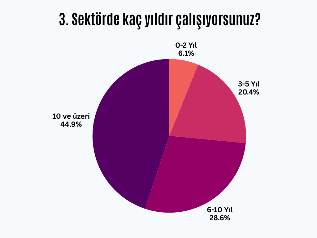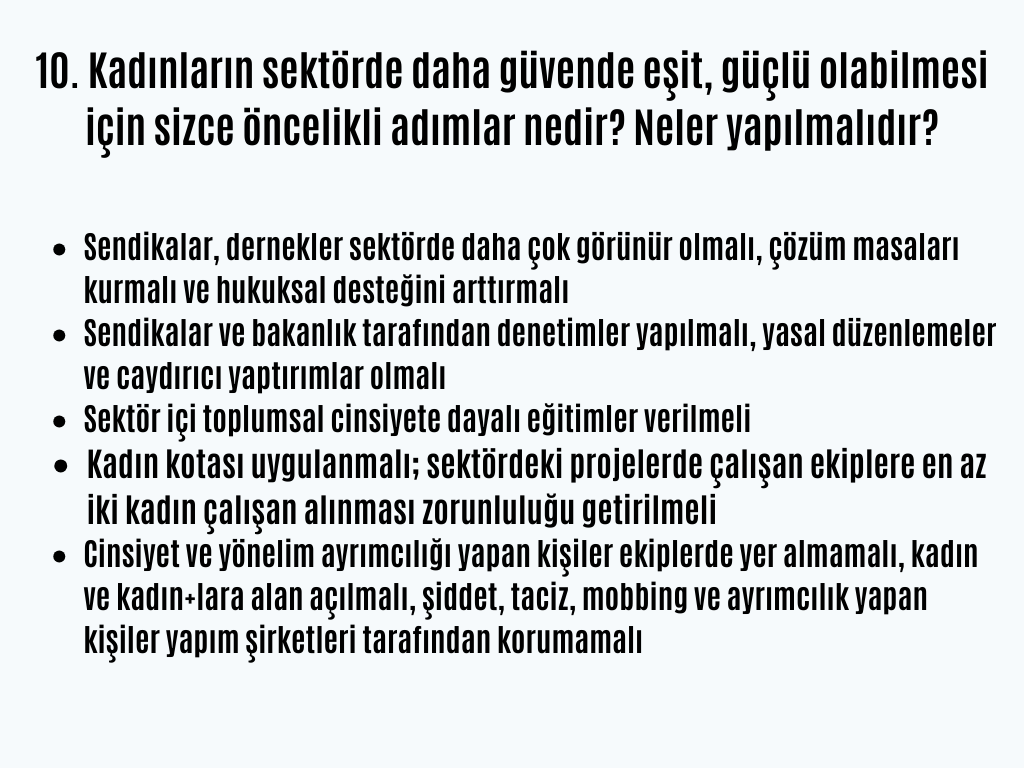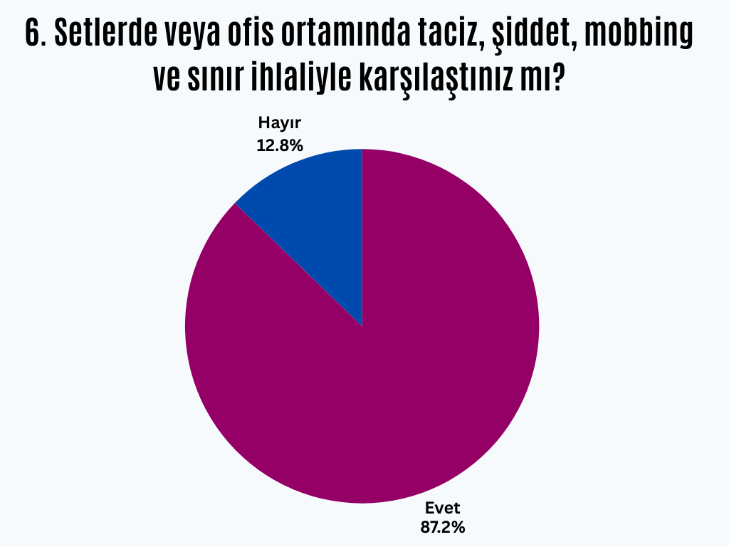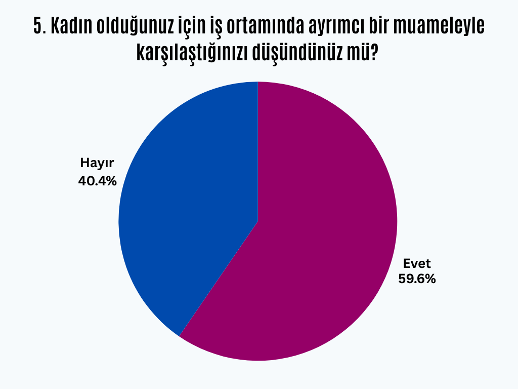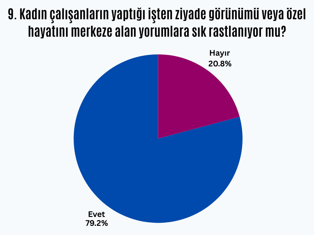 Cevaplardan elde edilen sayısal veriler bize şunu gösteriyor ki; sektörde çalışan kadınların %87,2‘si taciz, şiddet, mobbing veya sınır ihlali gibi ağır durumlarla karşılaşmaktadır. Bu oran, her 10 kadından yaklaşık 9’unun çalışma hayatında güvenli bir alana sahip olmadığını kanıtlar niteliktedir. Üstelik bu baskı ortamı, katılımcıların %81,3‘ünün küçümseyici ve dışlayıcı davranışlara maruz kalmasıyla desteklenmekte, kadınların %59,6′sı ise doğrudan cinsiyetleri nedeniyle ayrımcılığa uğradığını açıkça ifade etmektedir. Sektördeki deneyim süresi fark etmeksizin (katılımcıların %44,9’u 10 yıl ve üzeri deneyimlidir) bu sorunların devam etmesi, cinsiyetçiliğin profesyonel kıdemle değil, sektörel kültürle ilgili kökleşmiş bir sorun olduğuna işaret etmektedir.