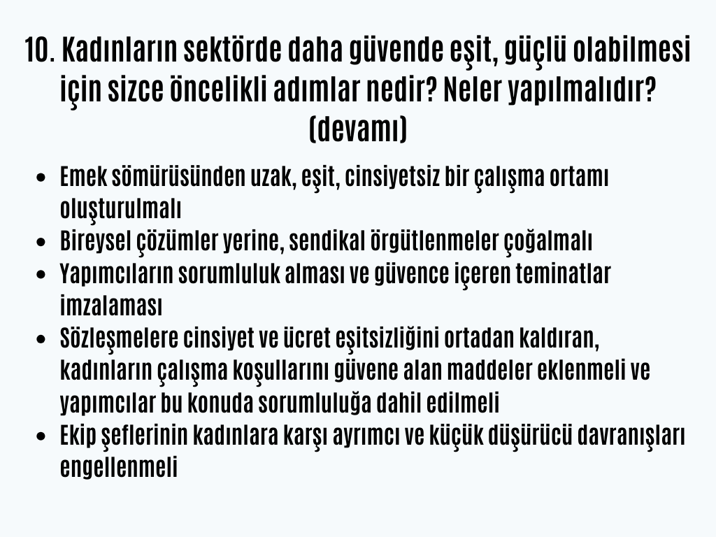 Verilerdeki en kritik açmazlardan biri, bu ihlaller karşısında başvurulacak mekanizmaların eksikliğidir; çalışanların %66‘sı kendilerini koruyacak bir dayanışma ağı veya hukuki mekanizma bulamamaktadır. Bu durum, katılımcıların %68,8‘inin fiziksel güvenlik (soyunma alanı, hijyen, ulaşım) konusunda “hayır” cevabı vermesiyle birleştiğinde, kadınların hem fiziksel hem de hukuki olarak korumasız bırakıldığını göstermektedir. Ayrıca, kadın çalışanların yaptığı işten ziyade dış görünüşünün veya özel hayatının merkeze alınması (%79,2), emeğin nesneleştirildiğinin en somut kanıtıdır. Katılımcıların çözüm önerilerinde dile getirdiği “denetimlerin artırılması“, “kadın kotası uygulanması” ve “sendikal faaliyetlerin etkinleştirilmesi” talepleri, bu sayısal tablonun ancak radikal ve yapısal bir dönüşümle iyileşebileceğine dair ortak bir iradeyi yansıtmaktadır.