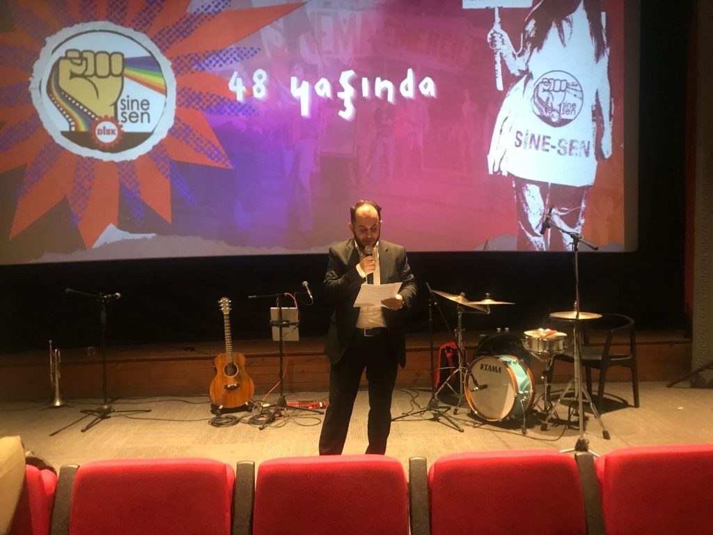 ”Sinema, film ve sahne emekçilerinin mücadele örgütü, DİSK’e bağlı Sinema Emekçileri Sendikası Sine-Sen’in 48. kuruluş yıldönümünü selamlıyorum. Sine-Sen, kurulduğu günden bu yana Türkiye’de kültür-sanat alanında emeğin adını koyan, emekçileri özne haline getiren ve örgütlü mücadelenin yolunu açan tarihsel bir mücadele odağı olmuştur.