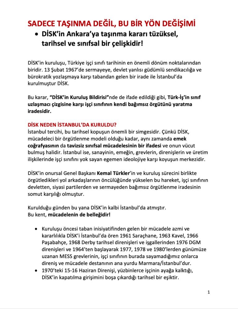 Aşağıda imzası bulunan sendikalar olarak DİSK Genel Merkezi’ni Ankara’ya taşınması kararından vazgeçmeye çağırıyoruz. DİSK, 1967’de sermayeye, bürokrasiye ve uzlaşmacı sendikacılığa karşı İstanbul’da kuruldu. Ankara’ya taşınma kararı, bu tarihsel...