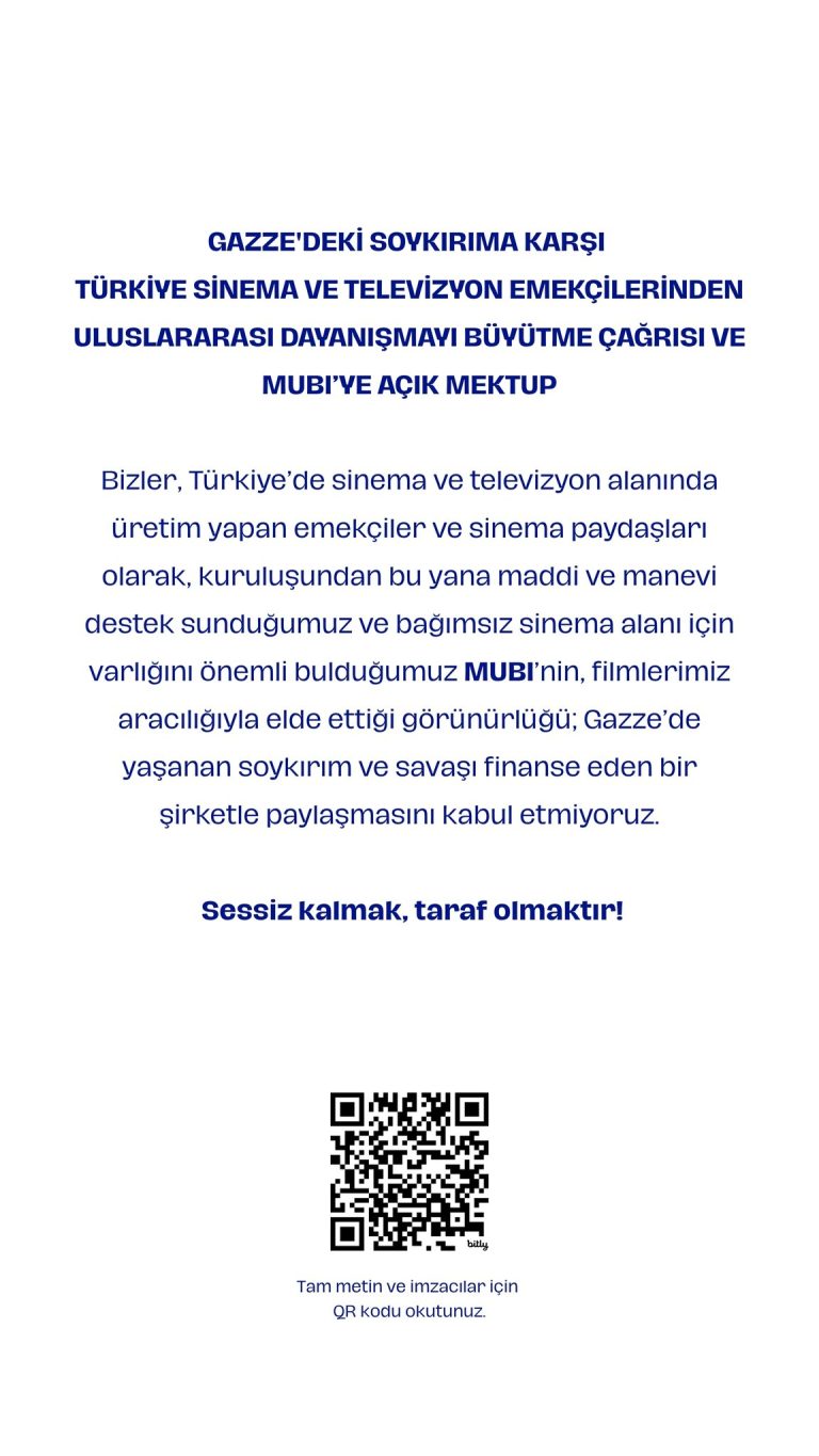 Sine-Sen olarak Gazze’deki soykırıma karşı sinema ve televizyon emekçilerinin MUBI’ye yaptığı çağrının imzacısıyız. Emeğimizin soykırım ortaklarının görünürlüğüne alet edilmesini kabul etmiyoruz. Sessiz kalmak, taraf olmaktır!